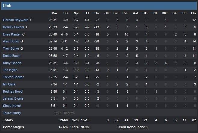 En difficulté des deux côtés du terrain, Utah est mené par un Alec Burks à 14 points. Gordon Hayward ne dépasse pas les 12 points et Trey Burke et Dante Exum suivent avec 11 unités. Le Jazz commet 23 pertes de balles qui ne pardonnent pas et concèdent 32 points sur contre-attaque. Des stats qui ont empêché les coéquipiers de Rudy Gobert (8 points à 3/4, 3 rebonds, 3 passes et 4 contres en 23 minutes) de représenter une véritable menace tout au long du match.