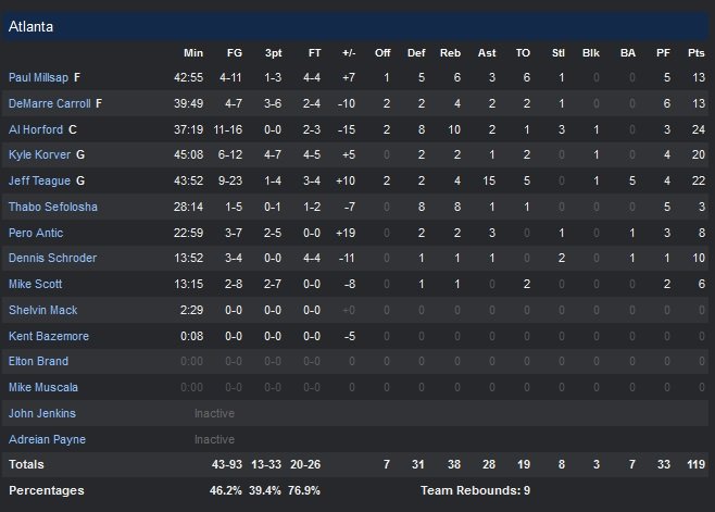 Toujours coincés à une victoire , les Hawks ont été menés par Al Horford (24 points), Jeff Teague (22 points) et Kyle Korver (20 points). À l’aise dans le partage du ballon cette saison (26 passes par match avant la rencontre et 28 passes contre Charlotte cette nuit), Atlanta a trouvé un adversaire à sa taille dans ce domaine (31 passes pour Charlotte) et s’est révélé un peu juste au pourcentage de réussite (46.2% contre 49.5% pour Charlotte) mais surtout au rebond (51 prises à 38). Cela n’a pas empêché les deux équipes d’avoir besoin de deux prolongations pour se départager. Atlanta comptait d’ailleurs encore 8 points d’avance à l’entame du quatrième quart. Les Hornets remonteront à 93-90 sur un 3-points signé Neal à 2″40 de la fin du match. Chaque formation s’échangent ensuite deux paniers avant que Cody Zeller ne permette à ses troupes de revenir à un petit point. Al Hoford se fait siffler un marcher de l’autre côté, Jefferson met un lancer sur deux et le score revient à égalité, 97-97.