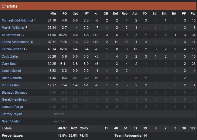 Pour son premier 3-points de la saison, Lance Stephenson (17 points et 13 rebonds) a fait fort. Le panier de la gagne, avec la planche et face au cercle le tout après deux prolongations face à Atlanta pour offrir une deuxième victoire consécutive aux Hornets sur leur parquet. Critiqué pour son début de saison en demi-teinte, l’ancien Pacer a mis tout le monde d’accord pour au moins une journée. Al Jefferson termine meilleur marqueur de Charlotte avec 34 points(15/24, 9 rebonds), Gary Neal sort 23 points du banc et les Hornets retrouvent un bilan équilibré de trois victoires pour trois défaites tout en effaçant une série de 6 défaites face à Atlanta à la Time Warner Cable Arena.