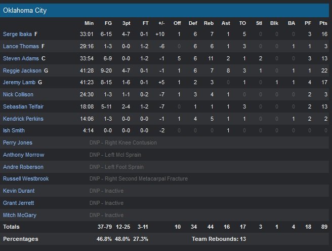 Reggie Jackson fait un excellent travail pour le Thunder (1V-5D) avec 22 points et son équipe parvient à dominer les rugueux Grizzlies au pourcentage de réussite mais également, et c’est plus rare, au rebond. Marc Gasol (8 points à 4/11 et 9 rebonds et seulement 1/5 en première mi-temps) se fait ainsi voler la vedette par Steven Adams (13 points à 6/9 et 11 rebonds) et Serge Ibaka (16 points à 6/15 et 7 rebonds) dans la peinture. Memphis s’en sort grâce à une précieuse attention au ballon et ne perd que 3 ballons sur les deux premiers quart-temps, ce qui permet à l’équipe de mener 49-40 à la pause, puis de marquer les 4 premiers points du troisième quart. Les lancers-francs constituent également une part importante du succès des Grizz’ avec un 14/17 (contre un tout petit 3/11 pour le Thunder).