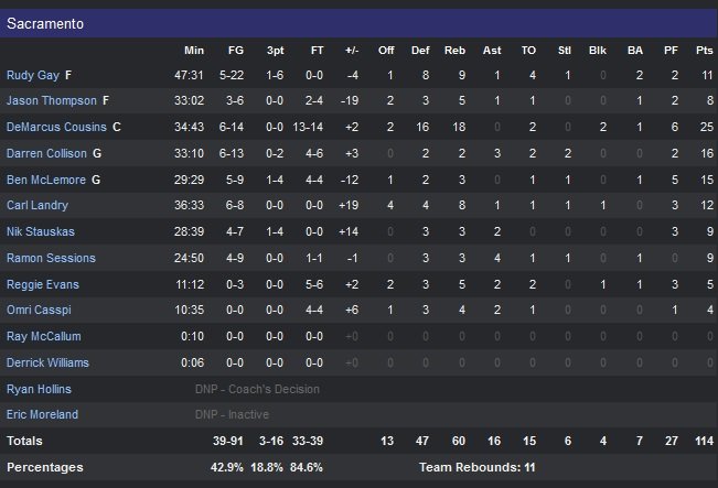 DeMarcus Cousins, sorti sur 6 fautes pour un écran illégal à 34,7 secondes de la première prolongation, est une nouvelle fois énorme avec 25 points et 18 rebonds. Darren Collison apporte 16 points et Rudy Gay (5/22), qui tourne à 24,4 points par match cette saison, termine à 11 points (dont les deux derniers du match). En face Eric Bledsoe signe 23 points et 8 passes pour les Suns (dominés 60 prises à 42 au rebond), qui ont subi un 22-11 dans le quatrième quart-temps après avoir largement dominé les premier et troisième quart-temps tout en ayant lâché du lest dans le deuxième. Menés par un Cousins survolté, les Kings vont remonter un déficit de 12 points dans le dernier quart. Le pivot californien inscrit 5 points dont deux lancers-francs pour égaliser à 94 partout avec 4″57 au compteur. Collison est également clutch avec 4 points dans ce passage important. À 1″37 du buzzer, Cousins obtient un 2+1 et Sacramento prend l’avantage pour la première fois depuis le début de la rencontre. Bledsoe égalise à 38,9 secondes restantes et Isaiah Thomas manque le potentiel 3-points de la gagne au buzzer contre son ancienne équipe.
