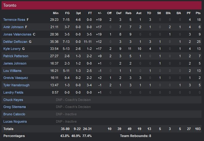 Bousculés par Amir Johnson (retourné au vestiaire après avoir aggravé son entorse de la cheville dans la troisième quart-temps) et Jonas Valanciunas, de retour dans la rotation, les Wizards n’ont jamais trouvé la solution. Ross inscrit 11 points dans le seul premier quart-temps pour aider Toronto à mener 28-18 après 12 minutes. Williams ajoute 9 points dans le deuxième quart, DeRozan 8 et les Raptors rentrent au vestiaire sereins avec une belle avance, 59-35. Malgré 13 ballons perdus (leur plus mauvais total cette saison), les Raptors ne sont pas inquiétés par des Wizards qui n’ont jamais aussi peu marqué dans chaque quart-temps cette saison (18 dans le premier, 17 dans le deuxième et 35 en première mi-temps) et qui a shooté à 3/19 derrière la ligne à 3-points toute la soirée.