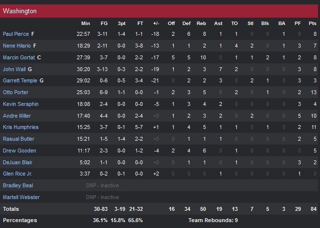 Washington n’aura pu compter que sur ses remplaçants à l’image d’Otto Porter et de ses 13 points ou Kris Humphries (11 points), deux des seuls joueurs adroits des Wizards avec Andre Miller (4/4) sur cette rencontre. Washington a ainsi shooté à 30/83 (36.1%). Un vilain défaut déjà bien en vue lors de leur dernier match contre Indiana mercredi, (37.4%). 0/6 pour Garrett Temple, 2/11 pour Nene, 3/11 pour Paul Pierce, 3/13 pour John Wall… Une vraie malédiction.