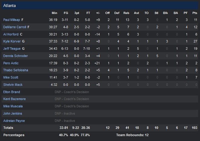 Perdants à San Antonio puis contre Charlotte de 5 points combinés, les Hawks avaient à cœur de se reprendre devant leur public. Jeff Teague termine à 19 points et trois de ses coéquipiers dépassent également la barre des 10 points, à l’image de Paul Millsap (11 points à 3/11 mais 13 rebonds). New York, qui revenait d’une défaite à Brooklyn, domine le premier quart-temps 32-20 et mène 61-48 à la mi-temps. Toujours sans Jose Calderon (mollet) et Pablo Priogioni (cheville), les Knicks se voient remonter petit à petit par leurs adversaires dans le troisième quart-temps et Atlanta finit par reprendre l’avantage pour la première fois depuis le premier quart, 75-74. Les hommes de Mike Budenholzer deviennent alors inarrêtables et marquent 7 points consécutifs pour passer devant 94-88 grâce notamment à un 3-points de Korver et deux paniers de Teague.