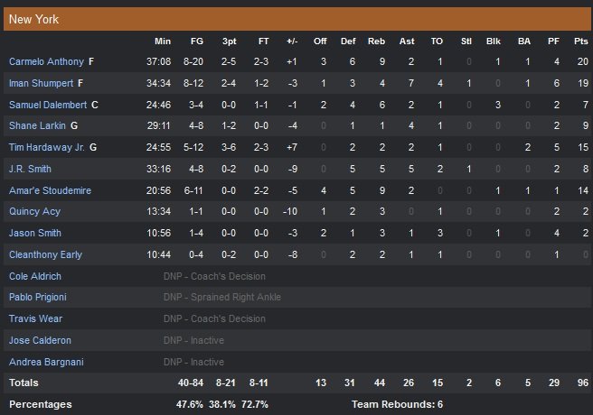 Étincelant dans le premier quart-temps (6/10), Carmelo Anthony a ensuite déçu tout au long du match en shootant à 2/10 durant le reste de la rencontre. Iman Shumpert termine lui à 19 points (il est sorti pour 6 fautes à 43 secondes de la fin du match) et a joué ailier après avoir été titularisé à la mène vendredi dans la défaite face aux Nets. Amar’e Stoudemire est toujours efficace en sortie de banc (14 points à 6/11 et 9 rebonds) mais ne joue que 20 minutes. À noter pour les Hawks la bonne entrée de Dennis Schroeder, qui a joué aux côtés de Teague la plupart du deuxième quart-temps en terminant à 11 points et 5 interceptions en 20 minutes de jeu.