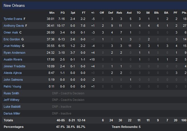 Malgré de gros efforts défensifs, San Antonio a perdu beaucoup trop de ballons pour espérer concurrencer l’intensité de New Orleans dans ce match. À l’aile, Tyreke Evans est agressif avec 18 points (dont deux buzzer beaters à la fin du deuxième et du troisième quart-temps), Jrue Holiday est à la baguette avec 15 points et 11 passes tandis que Ryan Anderson fait le boulot de loin (9 points à 3/7).