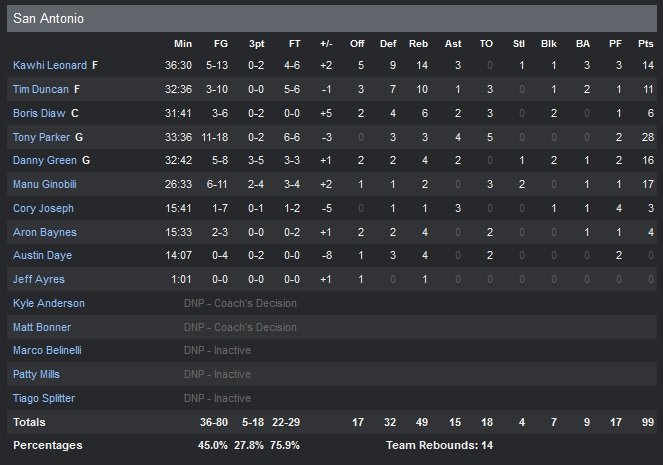 Après une première mi-temps équilibrée légèrement dominée par les Pelicans (55-53) grâce à un bon premier quart (30-23) derrière le duo Davis-Eric Gordon (14 points), les Spurs vont encaisser un 26-18 dans le troisième quart-temps qui leur sera fatal malgré un gros comeback (28-19) dans le dernier quart-temps. Les Pelicans ont profité d’une disette de plus de 5’30 dans ce troisième quart pour passer aux Texans un 12-2 et mener 81-71 après un shoot au buzzer à trois points de Tyreke Evans.