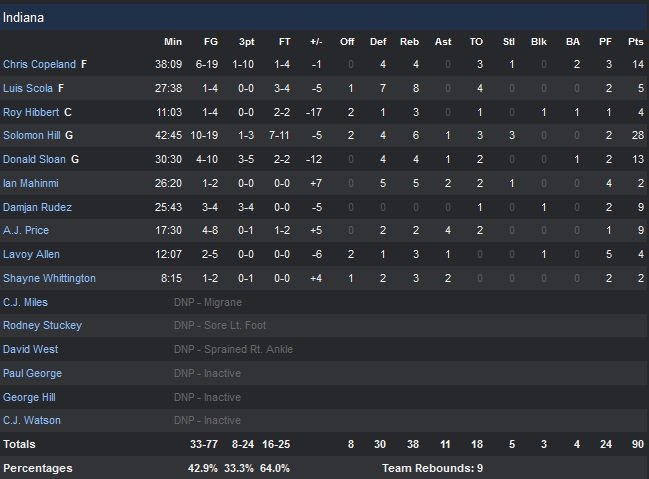 Le show Solomon Hill pouvait commencer au retour des vestiaires. L’arrière inscrit 12 de ses 28 points (record en carrière) dans le troisième quart et les Pacers passent un 30-19 à leurs adversaires pour se rapprocher à 6 points. Le score se resserre 81-78 à 8″17 mais les 5 dernières minutes se révèlent fatales avec un 2/10 aux tirs. Washington obtient ainsi sa première victoire en saison régulière à Indiana depuis 2007, mettant fin à une série de 11 défaites. Petite alerte pour Roy Hibbert, qui a quitté ses coéquipiers sur une douleur au genou gauche (4 points et 3 rebonds en 11 minutes).