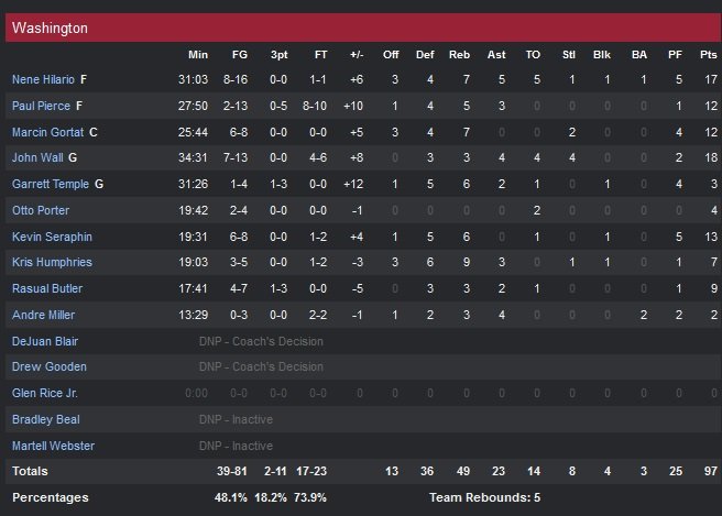Bien équilibrée, l’attaque de Washington a retrouvé un peu d’adresse dans le périmètre après sa vilaine défaite contre Toronto vendredi (19 points de retard) avec un John Wall à 18 points, un Nene à 17 points (dont 15 dans le premier quart) et trois autres coéquipiers dépassant la barre des 10 dont Kevin Seraphin, qui boucle son match avec 13 points à 6/8 et 6 rebonds en 19 minutes. Leur premier quart-temps dominateur se révèle donc être décisif avec une avance 32-14 après 12 minutes de jeu dans le sillage d’un gros début de match de Nene auteur de 15 des 21 premiers points des siens pour un score de 27-10. Gêné par les fautes tôt dans le match, Marcin Gortat n’a pu produire ses stats habituelles mais shoote à 6/8 et gobe 7 rebonds. Washington maintient la pression jusqu’à la mi-temps et mène 54-35 à la pause. Les Wizards remportent la bataille des turnovers 18 à 14 et marquent 22 points sur contre-attaque tout en dominant la peinture 48-34.