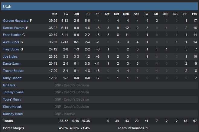 Derrick Favors (16 points 11 rebonds) et Enes Kanter (14 points 11 rebonds) ajoutent un double-double pendant que Dante Exum (9 points 5 passes) pallie bien à la nuit sans de Trey Burke (7 points à 2/8 et 3 passes) à la mène. En face la raquette de Motor City répond présente (51 rebonds à 43 sur la rencontre) avec 19 points et 11 rebonds pour Greg Monroe et 11 points et 18 rebonds pour Andre Drummond.