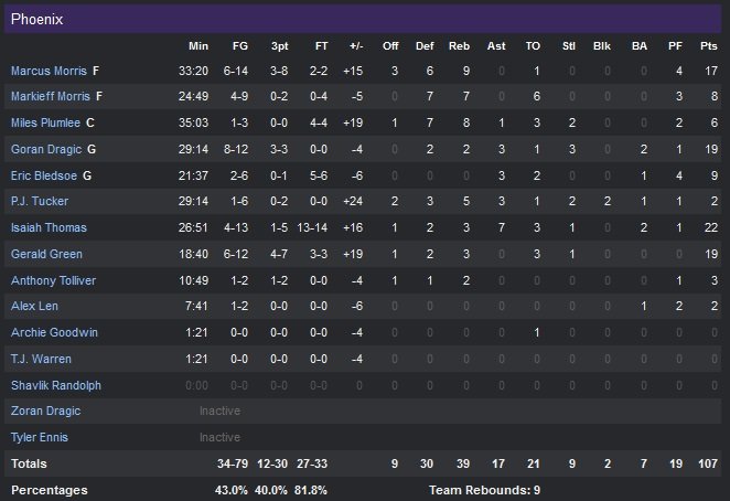 Spécialistes de la contre-attaque, les deux équipes courent beaucoup et les Suns prennent 9 points de retard à ce petit jeu dans le premier quart-temps, où Curry et Green combinent pour 20 points en 12 minutes. Goran Dragic (19 points à 8/12) inscrit 13 points dans la même période mais son équipe est menée 30-28 avant d’entamer le deuxième quart-temps. Curry offre la plus grande avance des Warriors sur un 3-points suivi d’une interception et d’un layup qui porte le score à 54-41 avec 2″31 à jouer avant la pause. Golden State retourne finalement au vestiaire avec 11 points d’avance, 58-47. Phoenix grappille des points petit à petit dans le troisième quart-temps, qu’ils remportent 24-21 et qui se termine sur un score resserré 79-71. Mais c’est dans le quatrième qu’ils feront la différence, avec pas moins de 36 points inscrits en 12 minutes tout en limitant Golden State à 16 unités. Les Suns reprennent ainsi l’avantage 83-82 sur trois lancers de Green à 8″55, puis 90-86 sur un 3-points de ce même Green à 6″07. Le panier du match est signé Marcus Morris, qui met dedans à 3-points avec 3″41 à jouer pour donner l’avantage 100-89 à Phoenix.