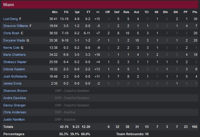 Beaucoup plus adroits que leurs adversaires, les joueurs d’Erick Spoelstra (55% aux tirs) contrôlent tout le match en s’appuyant sur une série en fin de premier quart (9-0 pour mener 29-20) puis un 8-0 en second (pour mener 51-37) avant de se laisser remonter au score sans gravité dans le dernier quart-temps. Résultat les Mavericks (42% aux tirs) se voient courir après le score à la mi-temps pour la première fois de la saison. En plus d’avoir été efficace en attaque, Deng a muselé Chandler Parsons en défense, limitant la recrue texane à 4 points et 1/9 aux tirs. Les 23 points de Monta Ellis (qui marque les 10 premiers points de son équipe en deuxième mi-temps) n’y feront rien, ni le gros double-double de Tyson Chandler (16 points et 15 rebonds). Dirk Nowitzki apporte 17 points mais Deng était trop fort cette nuit avec notamment 7 points durant un 12-2 en faveur du Heat dans le troisième quart qui redonna 14 points d’avance aux Floridiens.