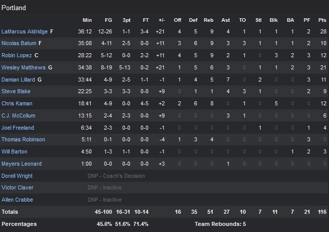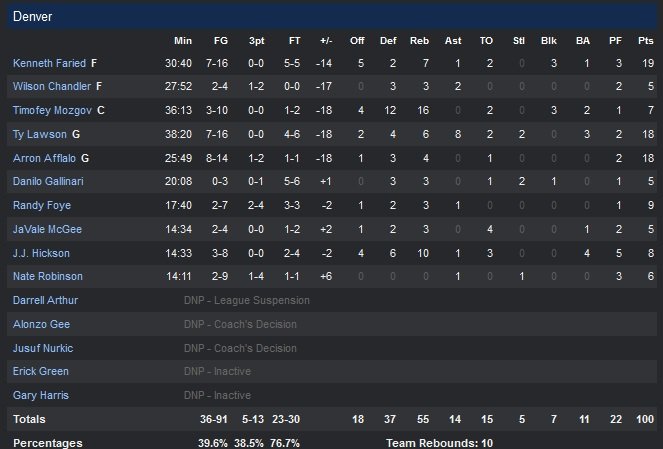 Malgré le retour de Ty Lawson (cheville) dans la rotation de Brian Shaw (18 points à 7/16, 8 passes et 6 rebonds) et les 19 points de Kenneth Faried, Portland (qui mènera de jusqu’à 17 points dans le dernier quart) s’est montré intraitable et encore plein d’énergie après sa douloureuse défaite à Los Angeles le jour précédent (106-102). Sans Darrell Arthur (suspendu), les Nuggets sont derrière 55-43 en première mi-temps et un shoot à mi-distance dont le n°12 de Portland a le secret. Denver se remet dans le match 59-54 sur un dunk de Timofey Mozgov mais Wesley Matthews (19 points en première mi-temps) rentre un 3-points au buzzer qui permet à Portland de mener 64-56 à la pause. Aldridge à nouveau donne 11 points d’avance aux siens en milieu de troisième quart (75-64) et Denver ne sera, à partir de là, plus jamais menaçant.