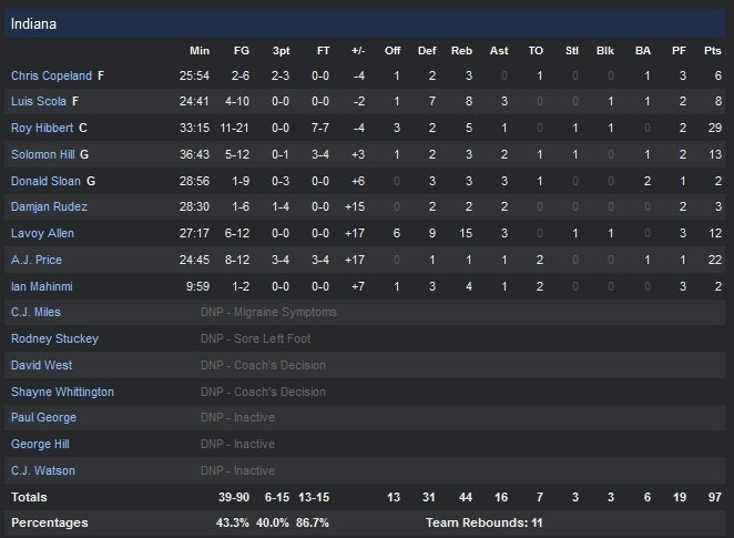 Indiana tient le choc grâce notamment aux 10 points de Price dans le quatrième quart, dont deux 3-points durant un 13-2 qui permet à Indiana de mener 87-79. Les Pacers (qui ne perdent que 7 ballons sur le match contre 11 pour leurs adversaires du jour) tiennent Hayward (de retour à la maison, l’ancien de Butler avait pris pas moins de 50 billets pour ses proches) à 4 points dans cette dernière période tout en la remportant 25 à 17. Après avoir subi 6 défaites d’affilée de 10 points, voilà un succès qui va faire du bien au moral du côté de l’Indiana. Rudy Gobert ne joue que 13 minutes pour 3 points (0/1, 3/4 aux lancers-francs) et 5 rebonds.