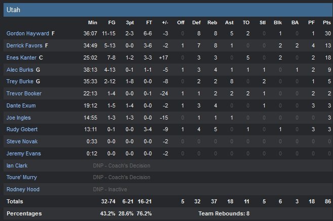 Dans le sillage de Gordon Hayward (30 points, 8 rebonds 5 passes), Enes Kanter (18 points à 7/8) et Derrick Favors (13 points et 8 rebonds), Utah remporte le premier quart-temps de trois petits points avant de voir les Pacers revenir dans le deuxième pour finalement mener 47-41 à la pause. Sans David West (cheville), George Hill (gneou) et Paul George (jambe), les Pacers résistent à un coup de chaud d’Hayward dans le troisième quart-temps. Durant cette série, l’ailier du Jazz va inscrire 13 points et son équipe passe un 19-4 aux hommes de Frank Vogel, prenant une avance 60-53 en milieu de quart-temps. Le trio Hibbert, Price et Solomon Hill remet même les Pacers seulement 3 points à l’entame du dernier quart 72-69.