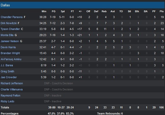 Les Kings (44% aux tirs sur le match) tiennent Dallas à 14 points et 24% de réussite dans le premier quart et sont devant 44-20 en début de deuxième quart. Ben McLemore est chaud et rentre ses trois premières tentatives à 3-points. L’adresse fuit ensuite les Kings dans le troisième quart-temps, où ils shootent à 26% tout en étant dominés 30 à 15. Ballon perdu sur ballon perdu (19 sur les trois derniers quarts !), Sacramento voit son avance fondre. Parsons enchaîne 8 points en un peu plus d’une minute pour permettre aux Mavericks de recoller à 5 points et Ellis les replace en tête pour la première fois sur un layup, 69-67. C’est à nouveau lui mais cette fois à 3-points qui donne 6 points d’avance à Dallas 78-72 avant de débuter le dernier quart-temps. Les 12 dernières minutes sont serrées mais les Mavericks répondent à chaque tentative de rébellion des Kings, portés par un trio Nowitzki/Parsons/Ellis revigoré et les aides précieuses de Brandon Wright et J.J. Barea.