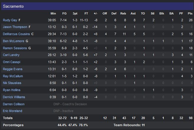 Dallas a lâché les chevaux en infligeant un 58-28 entre le milieu du deuxième quart-temps et la fin du troisième. Monta Ellis inscrit 10 de ses 16 points dans le troisième quart, dont un fadeaway à 3-points au buzzer après que Dallas ait pris son premier avantage du match dans cette 21e victoire de suite en saison régulière face aux Kings. Rudy Gay mène son équipe avec 26 points à 7/14, 8 rebonds et 8 passes. Chandler Parsons s’est bien rattrapé après avoir shooté à 2/20 sur ses deux derniers matchs. L’ancien Rocket termine à 19 points (5/11 à 3-points). Tyson Chandler a lui bien répondu au défi DeMarcus Cousins (16 points, 11 rebonds et 5 passes) dans la peinture avec un troisième double-double d’affilée : 14 points et 11 rebonds.