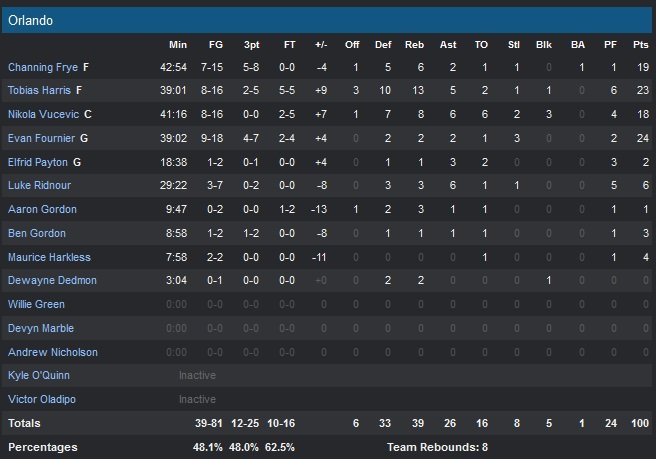 Les 24 points d’Evan Fournier et les 23 points et 13 rebonds n’auront donc pas suffi à une équipe du Magic trop brouillonne en fin de match. Channing Frye et Nikola Vucevic (8 rebonds 6 passes) ajoutent respectivement 19 et 18 points pour Orlando. En phase avec son shoot, Frye rentre ses 4 premiers tirs (dont 3 à 3-points), puis met dedans une nouvelle fois de loin sur la dernière possession du premier quart-temps et le Magic mène 32-24 après 12 minutes. Harris et Luke Ridnour scorent chacun 6 points dans le deuxième et Orlando continue son petit bonhomme de chemin jusqu’à la mi-temps, 60-51.