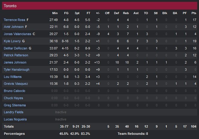 Kyle Lowry (19 points) et Terrence Ross (17 points) ont fait le nécessaire pour remonter un déficit de 11 points dans le quatrième quart-temps pour battre Orlando (2V-6D) 104-100. Les Raptors (7V-1D) restent ainsi invaincus à domicile (5V-0D) et obtiennent une 9e victoire consécutive face au Magic. DeMar DeRozan ajoute 16 points et Lou Williams, toujours aussi précieux en sortie de banc, apporte 14 points dont 8 dans le dernier quart-temps.