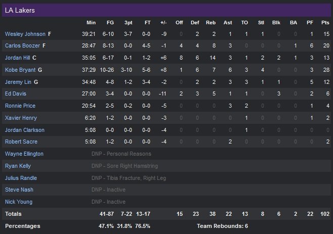 Kobe Bryant inscrit 28 points (10/26, 7 rebonds et 6 passes) mais prend la place peu flatteuse de joueur ayant raté le plus de shoots en carrière de John Havlicek avec 13 420 ratés. Les Grizzlies ont pu compter sur 16 points de Beno Udrih, 15 de Courtney Lee qui rattrapent la relative maladresse de la paire intérieure Zach Randolph (4/10, 11 points et 10 rebonds)/Marc Gasol (3/10) cette nuit. Bryant a peu de mal à se mettre en jambes en début de match (1/5) mais ses coéquipiers étaient assez adroits pour terminer la première mi-temps à 55% de réussite. Carlos Boozer (8/13, 8 rebonds) termine à 20 points, Wesley Johnson en ajoute 15.