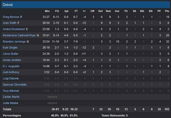 Detroit (2V-6D) perd de son côté pour la troisième fois d’affilée après avoir mené de 13 points dans le premier quart-temps, avec un Brandon Jennings qui inscrit 16 de ses 32 points (11/19 et 10 passes) dans les 12 premières minutes pour permettre aux siens de mener 21-11 puis 34-24. Rasual Butler (11 points dans le quatrième quart-temps décisif), dernier joueur à avoir été gardé par les Wizards avant le début de saison, s’avère être la surprise du jour avec 18 points à 7/8 et deux lancers-francs importants dans les dernières secondes de la rencontre.