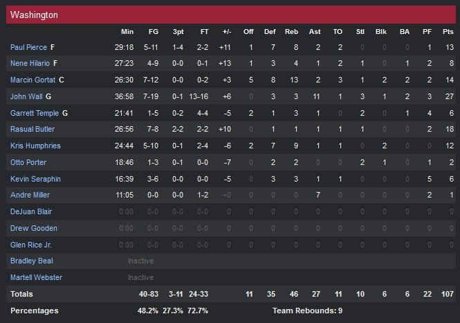 Washington réduit l’écart à deux points 59-57 à la pause grâce à un deuxième quart-temps très offensif (33 points marqués pour seulement 25 pour Detroit), mais ne trouve toujours pas de solution dans le troisième quart-temps, où l’équipe compte encore trois points de retard, 85-82, avant de se lancer dans le dernier quart. Largement dominés dans la raquette (46 rebonsd à 39), les Pistons n’ont pu compté que sur Greg Monroe (18 points et 9 rebonds) pour contrer la rotation complète de leurs adversaires. Kevin Seraphin (6 points) et Kris Humphries (12 points et 9 rebonds) font le boulot pour pallier au petit match de Nene alors qu’en face Andre Drummond (2 points à 1/3 et 5 rebonds) et Josh Smith (6 points à 3/10 et 9 rebonds) coulent leur équipe Un jeu d’allers-retours va alors se mettre en place puisque les deux équipes s’échangent cinq fois la mène sur cinq paniers consécutifs avant que Wall ne place les Wizards définitivement devant, 101-100. Marcin Gortat, qui termine à 13 points et 14 rebonds, claque un dunk à 38 secondes du buzzer et offre trois points d’avance à Washington.
