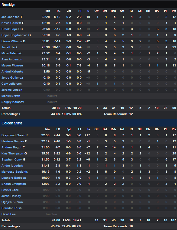 Dernière équipe de la ligue aux ballons perdus, les Warriors en ont perdu seulement 11 ce soir tout en shootant à 45.6% alors que les Nets ont eux shooté à 43.8% dont un petit 3/16 derrière la ligne à trois points. Andrew Bogut a une nouvelle fois été très précieux pour Golden State puisqu’il a fait le boulot des deux côtés du terrain, captant notamment 7 rebonds offensifs pour un total de 14 d’équipe. Il compile 11 points, 4 rebonds, 5 passes et 4 contres. Brook Lopez a ainsi était limité à 7/17 aux tirs pour 18 points. D-Will marque lui aussi 18 points et Joe Johnson seulement 12.