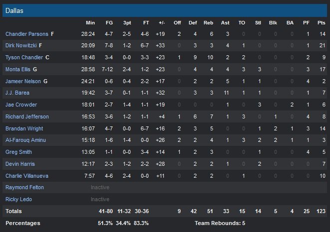 Philadelphie est désormais la seule équipe NBA à n’avoir encore gagné aucun match (0V-8D). Soit aussi bien qu’Utah l’année dernière mais pas encore au niveau des Nets de 2009-2010, qui avaient démarré leur saison sur 19 défaites. Dallas prend rapidement l’avantage 7-2 en deux minutes. L’écart passe ensuite à 27-9, puis à 38-10 à la fin du premier quart-temps. Nowitzki rentre ensuite deux shoots en suspension, les derniers de ses 5 shoots en première mi-temps et les Mavericks inscrivent les 7 premiers points du deuxième quart. Devant 73-29 (44 points d’écart) Dallas n’avait jamais mené d’autant de points à la mi-temps d’un match.