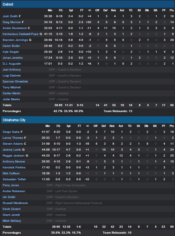 Jennings a inscrit 25 de ses 29 points en seconde mi-temps (à 5/8 à trois points) pour permettre aux Pistons de rattraper un retard acquis en première mi-temps après notamment un gros premier quart des locaux, remporté 30-21. Même si à la faveur d’un 12-3 Detroit était revenu à hauteur en début de second quart, à la pause OKC était en tête 48-42 grâce à un 11-2 dans le sillage de son duo Serge Ibaka (19 points et 10 rebonds) – Jeremy Lamb (24 points et 10 rebonds).