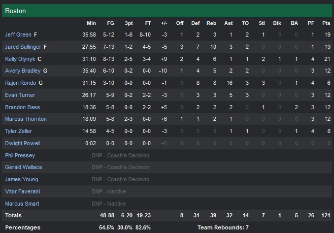 Rajon Rondo a particulièrement bien pris soin de ses coéquipiers avec 16 passes mais était plus en difficulté offensivement avec un 3/10 dont le potentiel shoot de la gagne tiré après le buzzer alors que le meneur avait une opportunité de drive avec un Shawn Marion sur le dos. Avant la rencontre, Cleveland était la 6e équipe autorisant le plus de points marqués en NBA alors que Boston se tenait à la 4e place. La première mi-temps est serrée entre les deux équipes et à la pause, Cavs et Celtics ne sont pas parvenus à se départager : 59-59. Aucune des deux équipes n’aura pris plus de trois points d’avance dans les 8 dernières minutes de cette première période. Le troisième quart-temps aurait ensuite très bien pu être fatal à Cleveland, qui laisse tout passer et qui encaisse un énorme 42-25 en 12 minutes de jeu. Boston (16/22 aux tirs dans le troisième quart) est serein avant d’entamer le quatrième et dernier quart : les Celtics mènent 101-84.