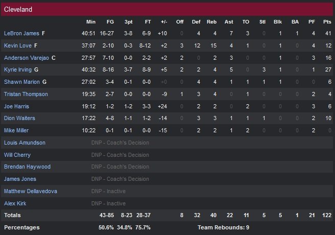 Kyrie Irving va alors prendre le match à son compte en inscrivant 13 des 15 points suivant de Cleveland, permettant à son équipe de réduire l’écart à 107-99 et 8″40 à jouer. James prend ensuite le relais dans les 6 dernières minutes du match avec 10 points. Son and one permet aux Cavs de mener de deux points 120-118 à 1″11 de la fin du match avant que Love n’ajoute un lancer-franc. Boston égalise ensuite sur un lancer convertit de Jared Sullinger et deux de Jeff Green. À son tour sur la ligne James rentre 1 de ses 2 tentatives à 36 secondes de la fin et donne un point d’avance à Cleveland. Les Celtics perdent ensuite un ballon précieux sur remise en jeu mais Kyrie Irving n’en profite pas et rate son layup, permettant à Avery Bradley de demander à temps-mort à 7 secondes de la fin du match.
