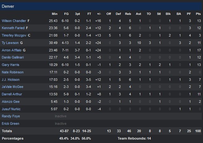 Kenneth Faried et Danilo Gallinari ont de leur côté signé 12 points chacun dans une équipe de Denver qui shoote à 49% sur la rencontre. Indiana (40.5% de réussite sur le match) est mené par les maigres 14 points d’A.J. Price alors que Roy Hibbert connaît un nouveau jour sans avec 9 points à 3/9 et 4 rebonds. Tout comme Chris Copeland, qui gratifie son équipe d’un joli 1/10 aux tirs pour 3 points et 5 rebonds (et 4 ballons perdus). Denver va rapidement faire tourner le match à son avantage. Dans le deuxième quart-temps, les Nuggets passent ainsi un 34-19 décisif qui leur permettra de prendre jusqu’à 32 points d’avance au fil de la rencontre. Les Pacers seront incapables de tenir le rythme, excepté dans le dernier quart face aux remplaçants de Brian Shaw.