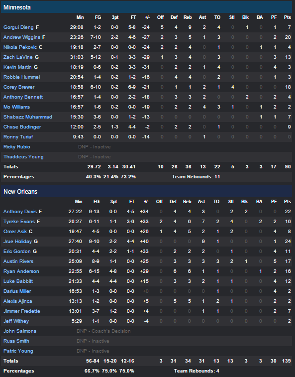 Jrue Holiday a mené ce beau monde avec 24 points à 9/10 et 9 passes en 28 minutes. 7 joueurs inscrivent au moins 10 points dont 22 à 9/13 pour Anthony Davis, 17 à 8/9 pour Austin Rivers et 16 pour Tyrke Evans et Ryan Anderson. Dominateurs à l’intérieur (56-36) et à l’extérieur, New Orleans a plié le match en 5 minutes en débutant par un 20-6 derrière Jrue Holiday et Eric Gordon (11 points à 4/4). A l’entrée du second 5 l’écart a continué de monter en flèche avec l’adresse du duo Luke Babbitt (12 points à 4/4 à trois points)- Austin Rivers. Ils ont inscrit 12 des 16 derniers points des leurs pour un score de 43-19 après un quart. Bien sûr les Wolves ne s’en sont jamais remis malgré les 20 points à 7/10 d’Andrew Wiggins, ces derniers étant totalement à la rue défensivement et pas au mieux offensivement avec 40% aux tirs et 22 ballons perdus. Corey Brewer sauve un peu les meubles avec 18 points en 18 minutes.