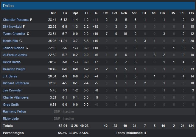 Pour leur deuxième match sans Ricky Rubio (cheville) et Thaddeus Young (décès de sa mère), les Wolves sont menés par un Kevin Martin à 34 points (12/17). Les vétérans Mo Williams et Corey Brewer ajoutent 13 points chacun alors que Shabazz Muhammad set met en valeur avec 18 points à 6/7 en seulement 13 minutes de jeu ! Malgré une grosse deuxième mi-temps, aucun des efforts des Timberwolves (50%) n’aura suffi à revenir au score, Dallas (55.3%) rendant toujours la pareille au moment voulu. Les Mavericks transforment une avance de 6 points en deuxième quart-temps en un écart de 21 points, 56-35 sur une claquette de Brandon Wright. Dallas mènera de jusqu’à 26 points dans une deuxième mi-temps dominée sur le papier par les Wolves (73-68). Ces derniers laissent leurs adversaires dépasser la barre des 100 points pour le deuxième soir de suite, tout en continuant de laisser leurs adversaires shooter à plus de 50% (c’était le cas dans 5 de leurs 6 derniers matchs).