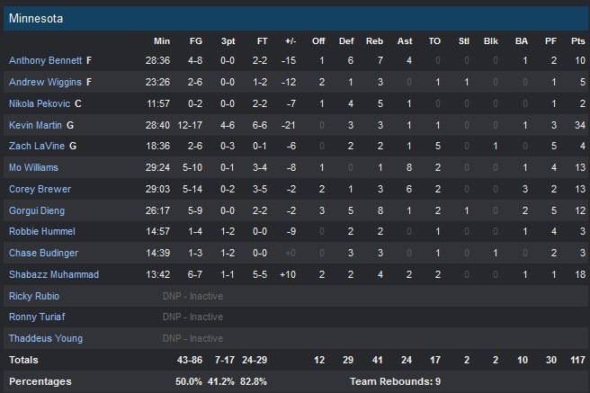 Pour leur deuxième match sans Ricky Rubio (cheville) et Thaddeus Young (décès de sa mère), les Wolves sont menés par un Kevin Martin à 34 points (12/17). Les vétérans Mo Williams et Corey Brewer ajoutent 13 points chacun alors que Shabazz Muhammad set met en valeur avec 18 points à 6/7 en seulement 13 minutes de jeu ! Malgré une grosse deuxième mi-temps, aucun des efforts des Timberwolves (50%) n’aura suffi à revenir au score, Dallas (55.3%) rendant toujours la pareille au moment voulu. Les Mavericks transforment une avance de 6 points en deuxième quart-temps en un écart de 21 points, 56-35 sur une claquette de Brandon Wright. Dallas mènera de jusqu’à 26 points dans une deuxième mi-temps dominée sur le papier par les Wolves (73-68). Ces derniers laissent leurs adversaires dépasser la barre des 100 points pour le deuxième soir de suite, tout en continuant de laisser leurs adversaires shooter à plus de 50% (c’était le cas dans 5 de leurs 6 derniers matchs).