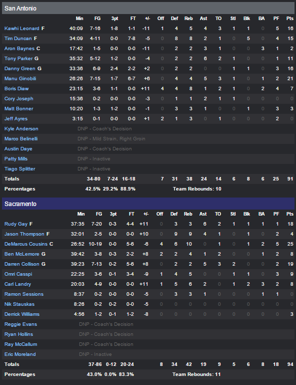 Pas beaucoup adroits que les Spurs sur le match (43% contre 42.5%) les Kings ont réussi à survivre à leur 0/12 à trois points en perdant seulement 9 ballons et en contrôlant le rebond. Le mauvais money time des Spurs a fait le reste.
