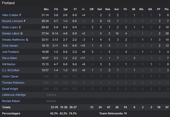 Joe Johnson (20 points) et Deron Williams (19 points) répondent présent, tout comme Kevin Garnett (12 points à 5/8 et 12 rebonds) mais la performance du banc (34 points à 15 en faveur des remplaçants pour les Trail Blazers) limite les espoirs de la franchise new-yorkaise. Portland affiche la couleur dès le premier quart en passant un 11-2 à l’équipe de Lionel Hollins et mène 24-15 après douze minutes. Williams inscrit les 10 premiers points de Brooklyn en deuxième quart-temps mais les Nets ne parviennent pas à réduire l’écart. Portland est toujours tranquillement devant 50-39 à la pause. Lillard et Lopez s’offrent 8 points chacun dans le troisième quart. Le meneur de 24 ans plante uun 3-points en milieu de quart-temps qui porte le score à 66-53. Wesley Matthews (10 points à 3/13, 5 rebonds et 3 passes) et Lillard se chargeront ensuite de maintenir les Nets à écart respectable malgré le petit coup de chaud de Jarrett Jack (10 points à 4/10) jusqu’à la fin du match.