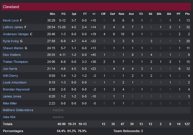 James bien sûr (4/5), Kevin Love (3/7, 13 points, 6 rebonds et 5 passes) Kyrie Irving (4/7, 20 points, 5 passes)) et plus étonnamment Joe Harris (4/5, 12 points) ont participé à cette fête de loin et Cleveland remporte sa 4e victoire consécutive en inscrivant 41 points dans le premier quart-temps, dont 11 pour James dans les premières 3″34 de la rencontre. Pour Atlanta, mené par Paul Millsap (16 points, 7 rebonds, 4 passes), le résultat est complètement inverse avec un 3/22 derrière la ligne et des Hawks qui ont peiné au rebond et dont les deux joueurs majeurs Al Horford et Jeff Teague n’ont pas répondu présent ( respectivement 12 points et 4 rebonds et 5 points à 2/8). Millsap inscrit le 1er panier de la rencontre, qui marque aussi la dernière possession du match à l’avantage d’Atlanta suite au 14/18 de Cleveland dans le 1er quart.