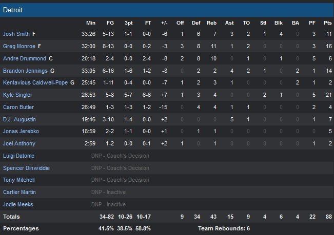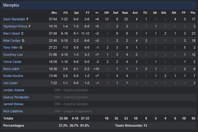 Mike Conley (18 points à 5/10) fait face sans problème à Brandon Jennings (14 points à 6/16, 4 passes) qui mène une ligne arrière de Detroit en terrible manque d’adresse (1/11 pour Kentavious Caldwell-Pope, 3/10 pour D.J. Augustin). Kyle Singler maintient son équipe en vie dans le match avec 21 points à 5/8. Ce sont pourtant bien les Pistons qui ont l’avantage au pourcentage dé réussite (42% contre 37% pour Memphis, notamment « grâce » au 1/10 de Vince Carter).