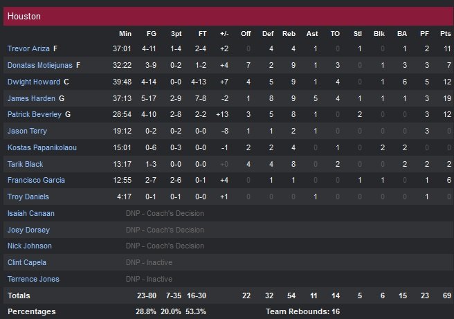 James Harden sauve ses troupes in extremis avec 19 points, Dwight Howard (12 points à 5/14 et 9 rebonds) est mis en difficulté par Serge Ibaka (5 contres), Steven Adams (6 contres) et Kendrick Perkins (3 contres). Le Thunder va ainsi contrer 11 shoots en première mi-temps, leur meilleur total dans ce domaine depuis leur déménagement de Seattle en 2008-2009. Malgré cette envie défensive, impossible de prendre l’avantage avec un pourcentage de 25%. Houston est à ce moment-là encore au-dessus des 30% (34%) et c’est donc logiquement que l’équipe de Kevin McHale est devant à la pause, 42-33. Un long shoot de Lance Thomas offre un premier avantage à OKC (51-49) en fin de troisième quart-temps mais les deux-francs d’Harden à 3.1 secondes permettent à Houston d’égaliser avant d’entamer le dernier quart.