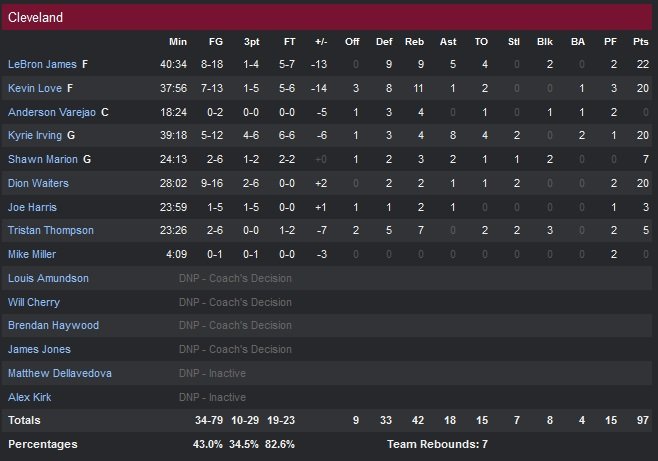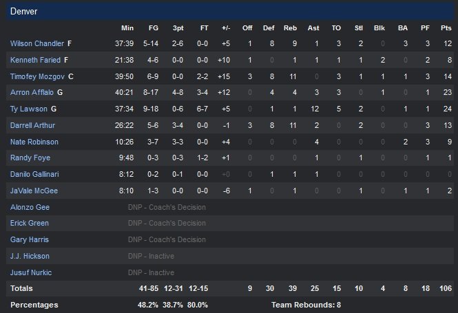 Élu joueur de la semaine pour la 46e fois de sa carrière quelques heures plus tôt, LeBron James n’avait pas participé à la séance de shoots matinale en raison d’un bon rhume. Il termine le match à 22 points à 9/18, 9 rebonds, 5 passes et 2 contres. Ses lieutenants Kyrie Irving, Kevin Love et Dion Waiters apportent chacun 20 points mais le ballon ne tourne pas encore idéalement dans l’Ohio (18 passes contre 25 pour leurs adversaires) et la raquette est bien vide. L’avantage va changer 11 fois de camp en première mi-temps avant que Denver ne prenne un court avantage 53-52 à la pause. Devant de trois points en début de troisième quart, les Nuggets inscrivent 4 points en une possession. Deux lancers de Mozgov après une flagrante sifflée à Anderson Varejao (0 point et 4 rebonds en 18 minutes), Lawson suit avec deux points. James répond par un 3-points mais Kenneth Faried inscrit un layup et Afflalo trouve lui aussi un 3-points pour donner 9 points d’avance aux siens.