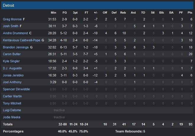 Pour leur 5e match en 7 soirs, les Pistons sont menés par Caron Butler (20 points) et Brandon Jennings, 18. Leur pourcentage de réussite est nettement inférieur à celui de leurs adversaires (40% contre 51.9% pour Orlando) et même leur relative bonne adresse à 3-points ne suffit pas face à des shoots du Magic très adroits (13/26 de loin contre 11/24 pour Orlando). À l’image de Fournier, le Magic a joué collectif et termine la rencontre avec 33 passes décisives, pendant que les Pistons n’en réussissent que 17. Sans régularité, Detroit domine malgré tout dans la peinture en première mi-temps et rattrape un pourcentage faiblard (42.5%), ce qui leur permet de rentrer au vestiaire avec une courte avance mais pas sereinement, 52-49.