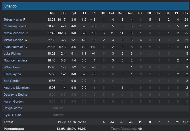 La raquette du Magic a fait très mal aux Pistons cette nuit, qui s’inclinent 107-93. Tobias Harris (10 /17, 5 rebonds, 4 passes, 5 interceptions) a inscrit 14 de ses 24 points dans le quatrième quart-temps et Nikola Vucevic (25 points à 10/18, 14 rebonds et 3 passes) a donné une leçon de basket au trio Greg Monroe/Josh Smith/Andre Drummond qui combine pour seulement 25 points et 17 rebonds. Notre Evan Fournier national n’était pas en reste avec 14 points à 5/13 et 8 passes.