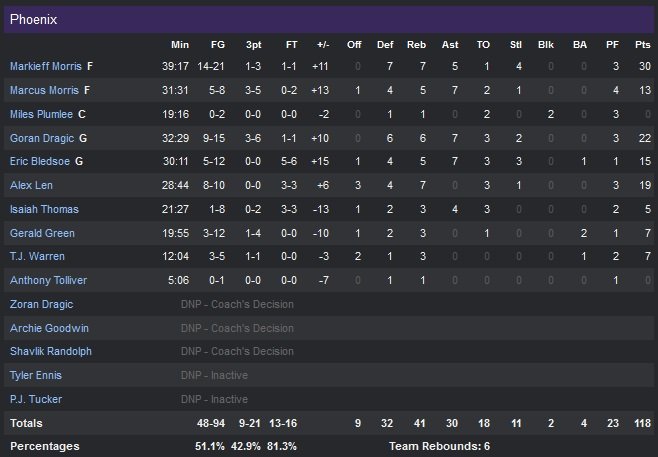 Markieff Morris a battu son record en carrière (30 points à 14/21, 7 rebonds et 5 passes) pour faire face aux 28 points de Jeff Green (10/17, 3 interceptions, 2 contres) et du presque triple-double de Rajon Rondo (14 points, 10 rebonds et 9 passes) cette nuit. Eric Bledsoe (15 points et 7 passes mais surtout une interception et un dunk décisif dans la dernière minute du match) clutch, Phoenix (6V-5D) s’impose 118-114 au TD Garden de Boston (3V-6D).