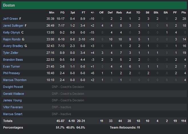 Aidés par les 22 points de Goran Dragic et les 19 points et 7 rebonds d’Alex Len, les Suns se remettent en selle après deux défaites consécutives. Boston subit de son côté sa troisième défaite de rang malgré une raquette efficace à l’image des 19 points et 7 rebonds de Tyler Zeller. Phoenix gère son début de match et prend 13 points d’avance dans le premier quart-temps mais se voit remonter pour finalement être mené 60-54 à la mi-temps. Les Suns réagissent en marquant 11 des 13 premiers points du troisième quart sur un 3-points de Marcus Morris dans le corner. Mais tout comme en première mi-temps, les Celtics reviennent et recollent à 89-88 sur un dunk de Zeller à la fin du troisième quart. Les Celtics retrouvent la mène pour la première fois depuis le deuxième quart sur un panier de Green, 105-104.