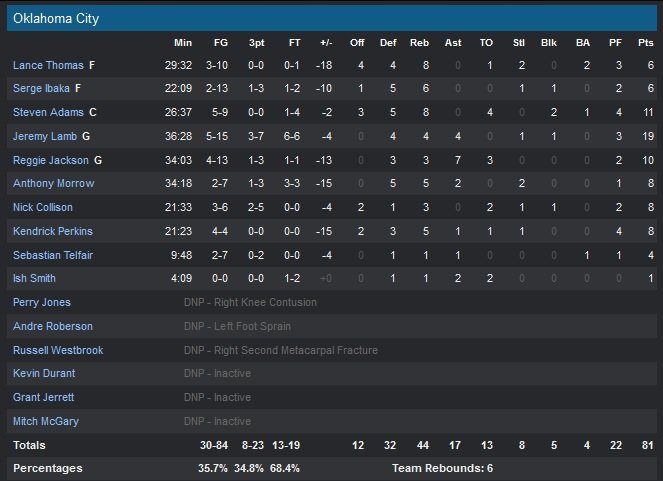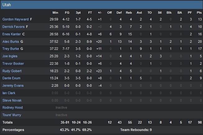 Plus discret en première mi-temps, Trey Burke termine à 17 points (dont 11 en deuxième mi-temps) et 9 passes. Oklahoma City, mené par les 19 points de Jeremy Lamb et les 11 points et 8 rebonds de Steven Adams, chute pour la 7e fois en 9 rencontres. Avant de vaciller en seconde mi-temps pourtant, le Thunder prendra jusqu’à 17 points d’avance. Menés de plus de 10 points depuis le début du match, le Jazz est secoué par une intervention de son coach Quin Snyder au milieu du terrain. Ce dernier proteste contre une faute sur une tentative de dunk d’Adams dans le deuxième quart-temps. Le coach prend une technique et crie à son équipe : « réveillez-vous ! » avant de se rasseoir. Une colère payante puisque Utah répond par 10 points consécutifs et se retrouve avec seulement deux points de retard à la mi-temps, 42-40.
