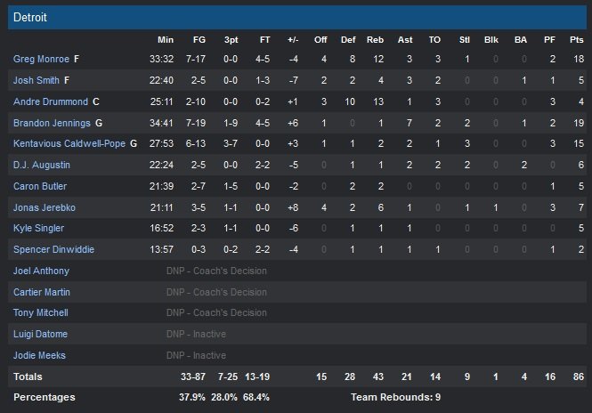 Menés par les 19 points de Brandon Jennings, les Pistons perdent leur troisième match consécutif et leur 6e rencontre en 7 confrontations. Greg Monroe (18 points à 7/17 et 12 rebonds) est efficace dans la peinture alors que son acolyte Andre Drummond (4 points et 13 rebonds) se concentre sur les rebonds et Kentavious Caldwell-Pope est utile en complément de Jennings au scoring (15 points à 6/13). Phoenix dicte le tempo en première mi-temps, forçant les Pistons à sortir de leur zone de confort, sans pour autant parvenir à prendre un réel avantage. Grâce à 9 rebonds offensifs, Detroit reste dans la course 44-43 à la mi-temps.