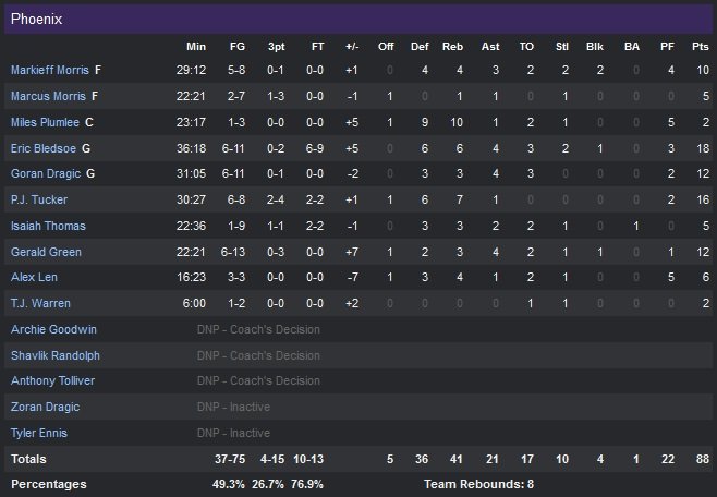 Eric Bledsoe a inscrit 18 points (6/11, 6 rebonds et 4 passes) dont le panier de la victoire à 28.7 secondes et le lancer-franc décisif pour Phoenix (7V-5D) à Detroit (3V-9D). Les Suns remportent ainsi leur 4e victoire en 6 matchs, 88-86. P.J. Tucker ajoute 16 points pour Phoenix, qui a profité de la maladresse de ses adversaires.