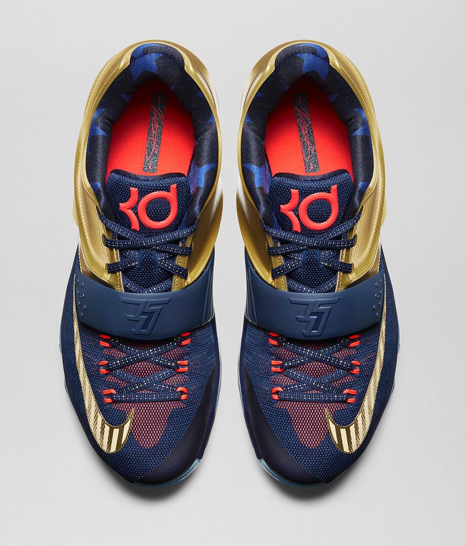 Bien que Kevin Durant n’ait pas participé à la coupe du monde, Nike va sortir un modèle ‘Gold Medal’ des KD7 samedi au prix de 170$.
