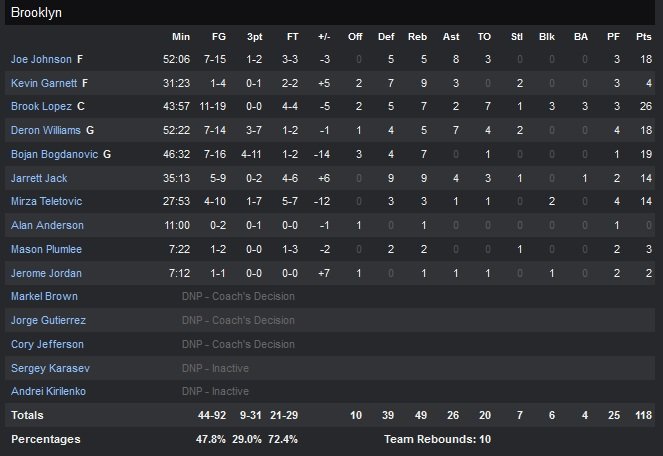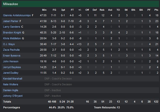 Les Bucks ont survécu à l’immanquable layup de Brandon Knight en fin de 1ère prolongation et remportent finalement une rencontre interminable, 122-118, au terme de trois overtimes. Jason Kidd repart donc avec une victoire pour son premier match à Brooklyn, qu’il a coaché la saison passée. Knight s’est bien rattrapé avec un 3-points égalisateur en plus de deux lancers-francs clutchs à 5.6 secondes de la fin de la deuxième prolongation dans une rencontre qu’ils auraient pu/dû boucler bien plus tôt.